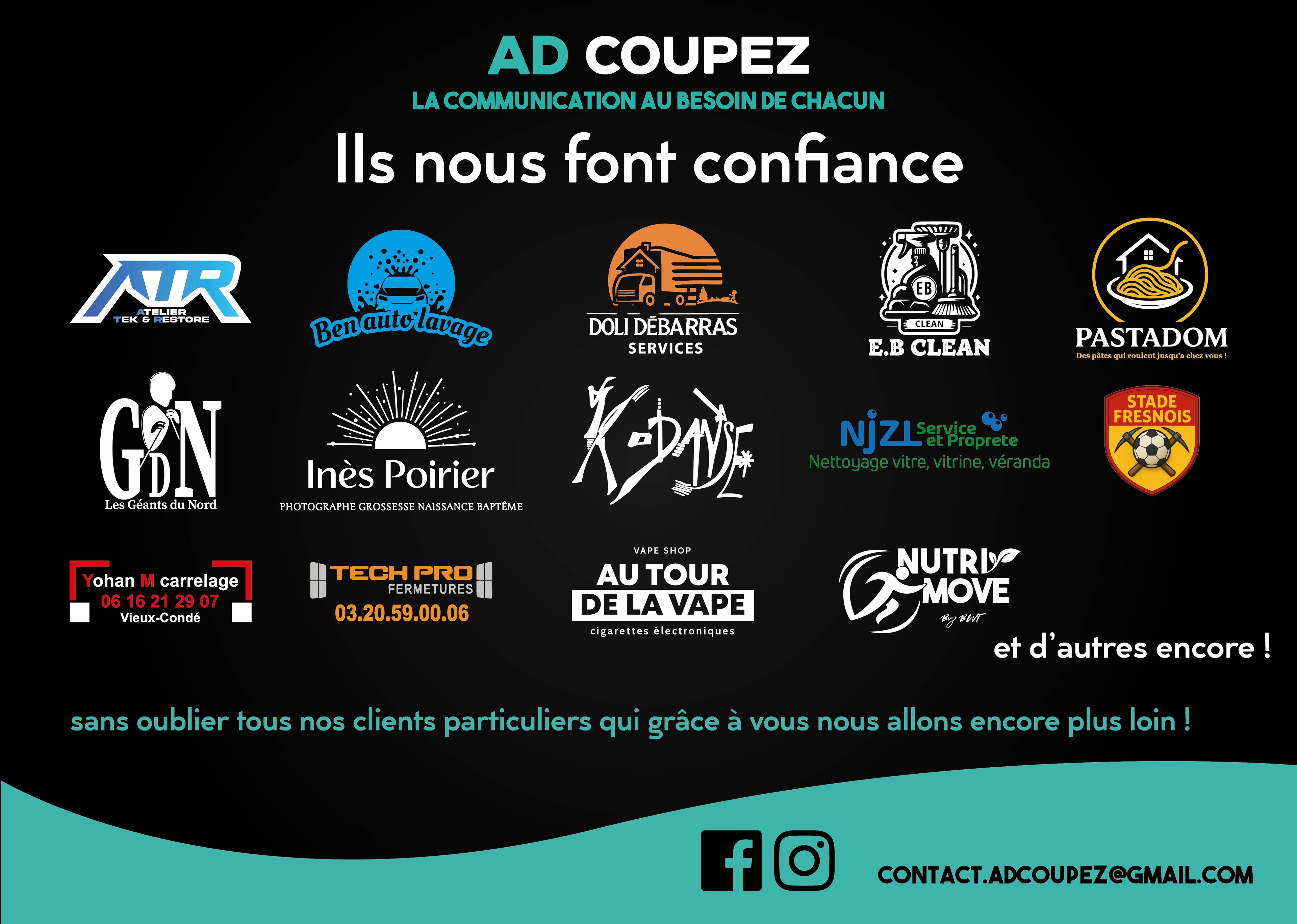 AD COUPEZ est une entreprise spécialisée dans la création, impression et pose d'adhésif sur tout support (véhicules, vitrines, panneaux, etc ..), le flocage textile que ce soit la création du visuel jusqu'au flocage en couleur ou en monochrome ainsi que la conception et l'impression de vos supports de communication (flyers, affiches, cartes de visite, etc...).